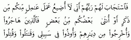 ف اس ت ج اب ل ه م ر ب ه م أ ن ي ل ا أ ض يع ع م ل ع ام ل م ن ك م م ن ذ ك ر أ و أ ن ث ى ب ع ض ك م م ن ب ع ض ف ال ذ ين ه اج ر وا و أ خ ر ج وا م ن د ي ار ه م و أ وذ وا ف ي س ب يل ي و ق ات ل وا و ق ت ل وا ل أ ك ف ر ن ع ن ه م