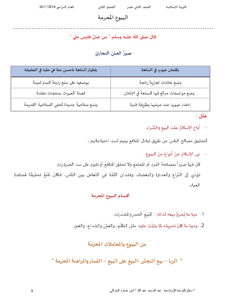 ملخص الدرس الثاني البيوع المحرمة اسلامية