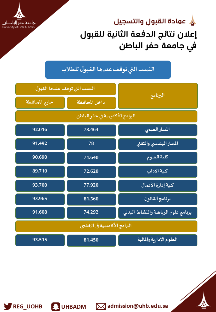 عمادة القبول والتسجيل On Twitter تعلن عمادة القبول والتسجيل في جامعة حفر الباطن عن نتائج قبول الدفعة الثانية للعام الجامعي ١٤٤٢هـ